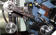 ● 半封閉環(huán)保友好型設(shè)計,機(jī)械手自動裝夾鋸片,一人可操作10-15臺設(shè)備。